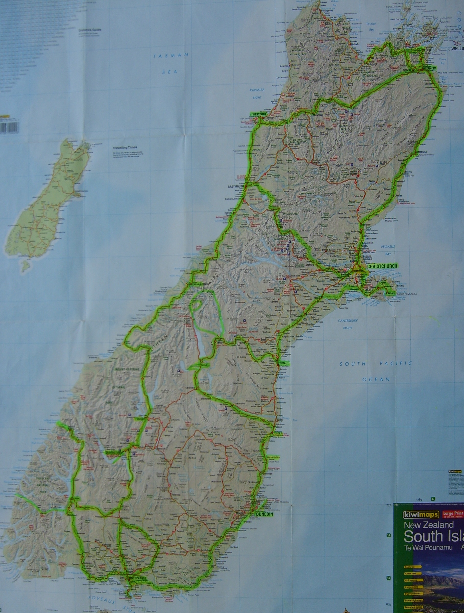 In September 2007 Gae & I flew to Christchurch. We had a few day looking around the city before taking the train over Arthur’s Pass to Greymouth for the day. We then hired a car and travelled for three weeks around the South Island. When at Lake Tekapo we joined a charter flight up and around Mt Cook and over the Glaciers. Below is a map of where we travelled.