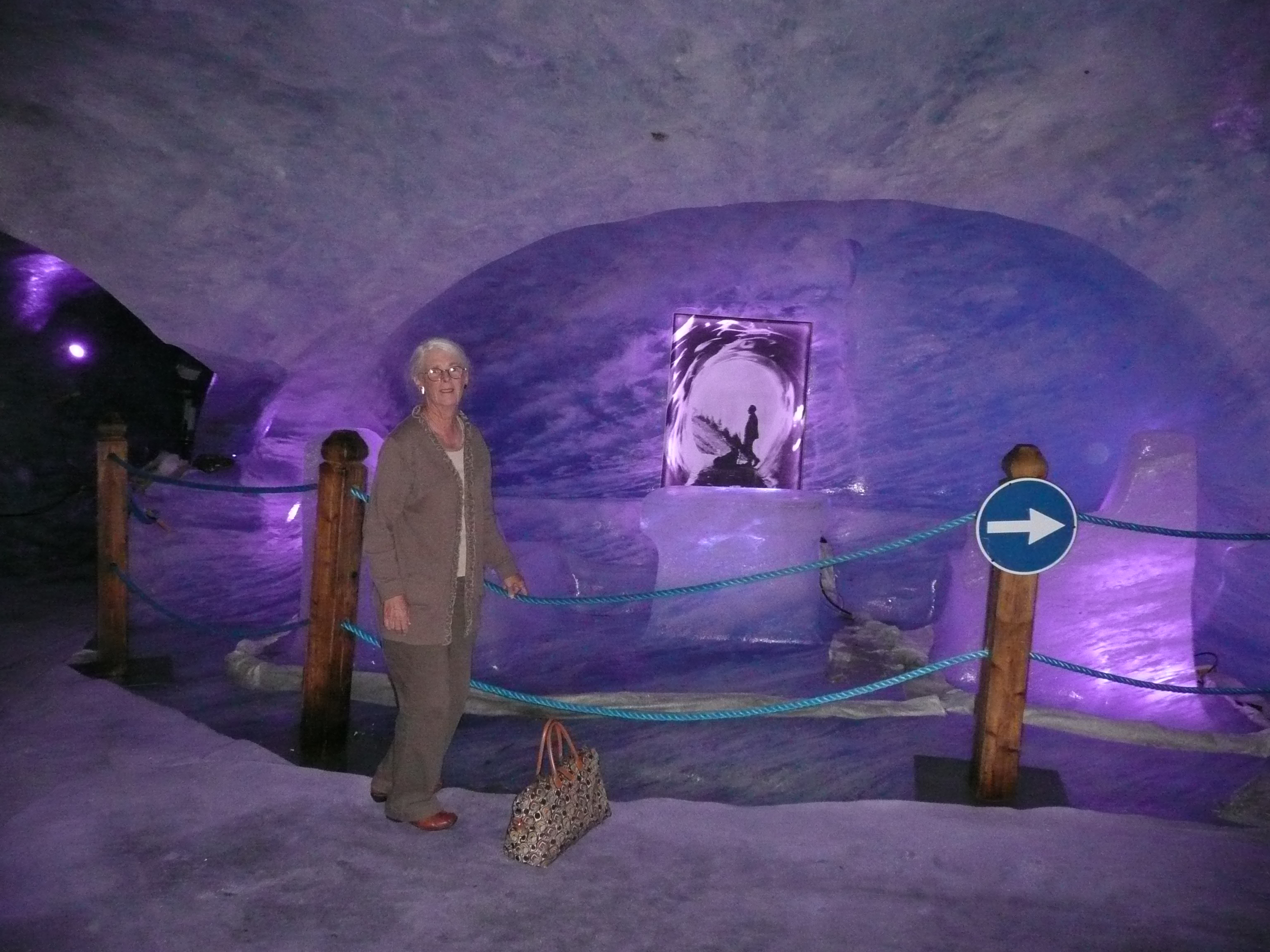 Thursday we caught the cog railway up to Montenvers Mer de Glace which is 30 minute journey up from Chamonix to the station at 1913m. A little, old train with wooden bench seats carrying those who are sightseeing as well as those who have more vigorous pursuits planned, such as walk to the glacier or back down to the town. The train was reasonably full, but they dispersed rather rapidly when we reached the top. Quite a few were walking up as well, once again, I have to admire their fortitude for the such activities. Once we had looked over the glacier we walked down the steps to the Ice Cave (some 400 in total) and then had to walk back up them all. In the afternoon John walked part-way up one of the hiking trails to the restaurant and back.