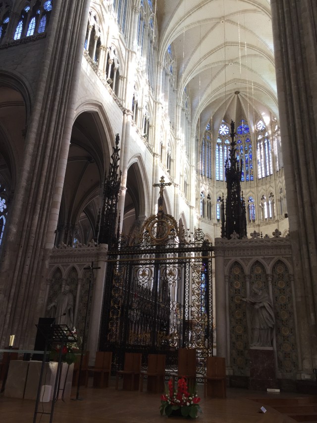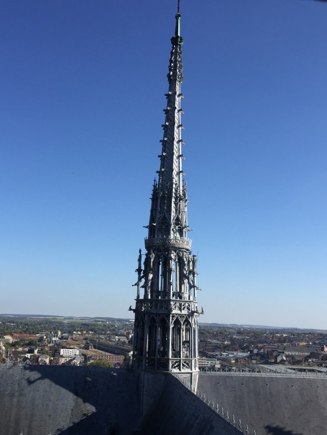 A drink downstairs in the bar watching the sunlight on the Amiens Notre Dame Cathedral before going for a walk to find some dinner – the hotel dining room does not open until 7pm, nor does anything else apparently. We ended up eating crepes at a coffee shop and they were delicious; we then walked back to the hotel via the Cathedral so we could study the outside of the building bathed in the golden light of the fading sun.