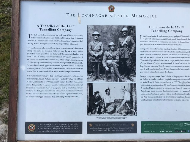 ”The Lochnagar mine south of the village of La Boisselle in the Somme Département was an underground explosive charge, secretly planted by the British during the First World War, ready for 1 July 1916, the first day on the Somme. The mine was dug by the Tunnelling Companies of the Royal Engineers under a German field fortification known as Schwabenhöhe (Swabian Height).
